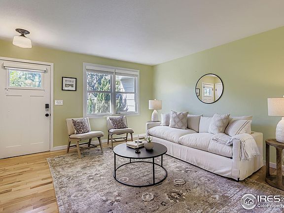 Accepting Back-up Offers!!! Welcome to this peaceful and charming ranch home located in central Loveland. Move-in ready with updated kitchen and color scheme. Hardwood floors greet you at the front door and extend into the kitchen. There is room for your intimate dining room table or dine al fresco on the covered patio with mood setting patio lights. Nice size mature yard with garden beds for that garden to table experience. The family room has a wood burning fireplace and a modern epoxy floor for durability and longevity. The primary bedroom has its own ensuite and large built-in closets to compliment modern living. Built-ins in the spare bedroom are included. No HOA and move-in ready. Home has a brand new water heater and comes with a one year First American Home Warranty for your peace of mind. 5 year roof certification included.