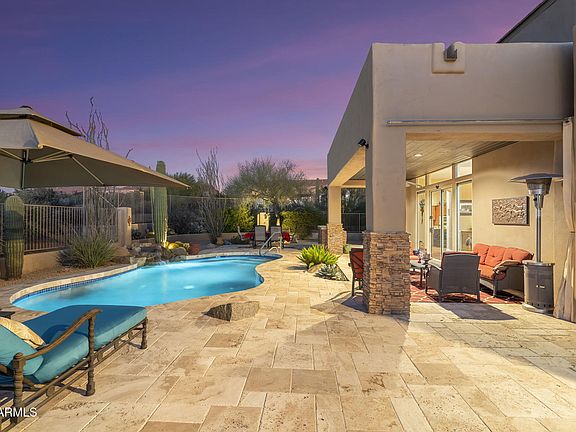 Experience refined indoor-outdoor living in this beautifully upgraded private Troon North retreat. Quiet culdesac w/lush desert & mountain views this 0-step 1-level gem blends timeless style w/modern upgrades. Ideal as primary or lock-n-leave. Thoughtfully updated w/wood floors, plantation shutters, quartz counters, cabinetry, induction cktp, stainless appl. Designer touches w/mesquite shelving, barndoor & cedar-lined closet. Resort Yard features upgraded PebbleTec pool, new Sundance spa, travertine patios, wood-ceiling veranda, BBQ & enhanced desert landscape. Major updates: new AC, pool heat pump, full plumbing, skylight, foam roof coating, cameras, interior paint, new doors & stunning handcrafted custom iron entry w/mtn views-creating turnkey, move-in-ready luxury escape. CLICK ''MORE'' Nestled in the high Sonoran Desert, this coveted Troon North location offers one of Scottsdale's most exceptional lifestyle settings where luxury, nature, and recreation meet. Residents enjoy breathtaking desert vistas, dramatic boulder formations, and Scottsdale's acclaimed Dark Sky Initiative, preserving star-filled nights and serene evening ambiance.