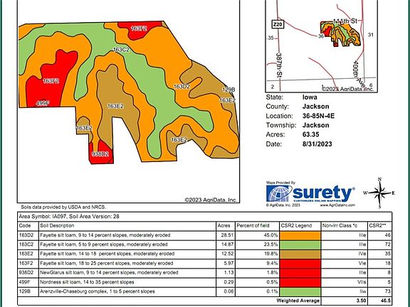 This is a nice-laying, 68.04-acre Jackson County farm. Primary soil on the 63.35 cropland acres is Fayette. CSR2 on the FSA/Eff. crop acres 46.50. See soil map for detail. Seller has two additional tracts of land for sale located east and southeast of this property. See Additional Land Aerial Photo.