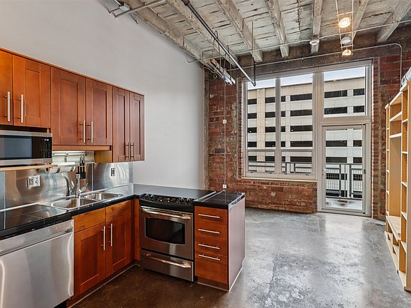Functional open layoutModern appliancesExposed brick and ductworkBathroom vanityUpdated kitchenCustom window treatmentsNatural light