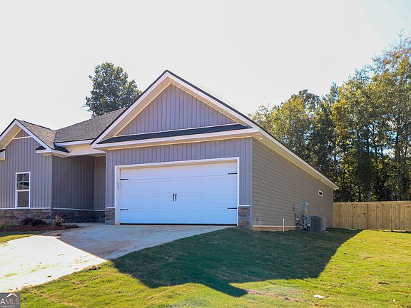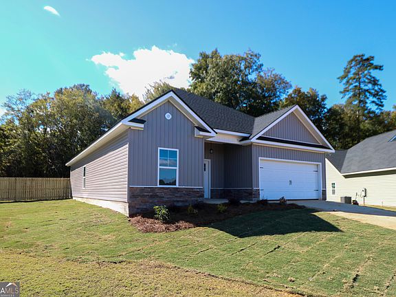 Welcome to Cottages of Blue Ridge! This recently built, Oakland Plan, single-level home, offers four bedrooms, three full bathrooms, and a privacy fence. Complete with all the amenities you expect from new construction. Luxury Vinyl Plank flooring graces the main living areas. The open floor plan features a spacious living area with a stunning coffered ceiling and an electric fireplace with a wood mantle. The kitchen boasts shaker cabinets, a large island with breakfast bar, granite countertops, stainless steel appliances, and tiled backsplash. The primary bedroom features a decorative box tray ceiling and a bathroom with a striking tile shower with a frameless glass shower door and a freestanding tub. Additionally, the main living space leads to a covered patio, ideal for entertaining. The tranquil, tree-lined, fenced backyard is an oasis of calm. The property is zoned for Bonaire Elementary, Bonaire Middle, and Veterans High School. The house is conveniently located minutes from ROBINS AFB and close to all your shopping needs on Hwy 96.
