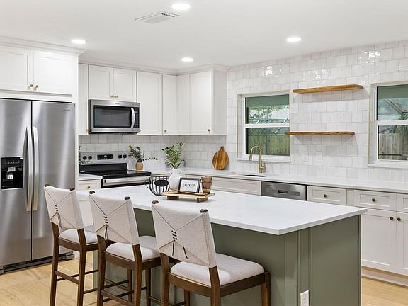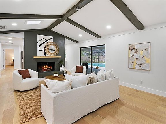 Large fireplaceStylish gold hardwareLarge central islandNewly renovated kitchenUpdated vanitiesElegant quartz countertopsCozy family room