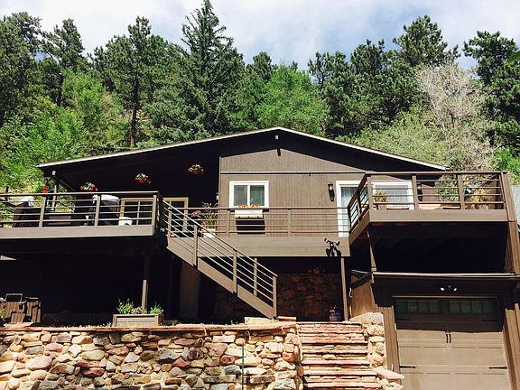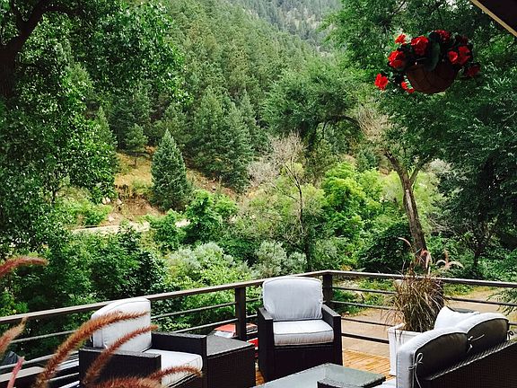Property is currently under contract but a backup offer may be considered. Rare opportunity to own a beautifully renovated home right on Boulder creek! One mile from downtown Boulder, but lives like a mountain retreat. 2 BR, 2 BA home nestled in Boulder Canyon, with 360 mountain views. Fully renovated within the last three years. Vaulted wooden ceilings and solid wood floors. New wooden blinds on all windows. Four large skylights for added light. Floor-to-ceiling stone wall with 48” modern fireplace. Crystal chandelier in dining nook, and new lighting throughout with modern dimmer switches on all. Brand new master and guest bathrooms, each with glass tile and modern decor. Oversize shower in the master bath, new jacuzzi tub in the guest bath. Showcase custom kitchen with double thickness white quartz countertops, new custom cabinetry and a mobile kitchen island. New refrigerator, modern gas stove with two oven drawers, and two-drawer dishwasher. Cozy flex space in the basement for workout room or office. Custom-built murphy bed and built-ins in the guest room. Potential for a 3rd bedroom in the lower level of County allows due to size of septic, currently used for storage. Remote and smart phone controlled security system. One car garage. Large, secure, and covered dog enclosure (6’x16’) with doggie door access to the house. Beautiful patio that backs to the mountain. Two large decks that overlook the river for entertaining. Riverfront entertaining right on the water. Wildlife viewing all year round. Property will be entered into the MLS approximately end of December. Please call broker Lou Scirrotto, REMAX of Boulder wth any questions.