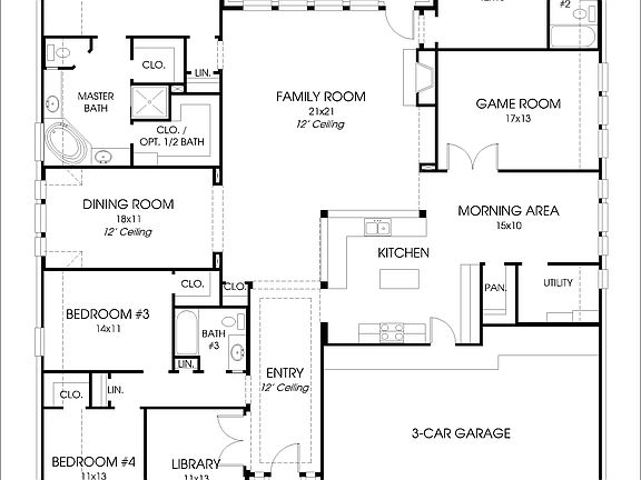 Mahogany front door. Extended entry with a 12-foot ceiling. Formal dining room and library with French doors, both with ceramic tile floor. Open family room with ceramic tile floor and a cast stone fireplace. Kitchen features island and a walk-in pantry. Spacious master suite with a wall of windows. Master bath includes garden tub, separate glass-enclosed shower, two vanities and two walk-in closets. Guest bedroom with full bath and walk-in closet. Game room just off the morning area. Covered backyard patio. Three-car garage.