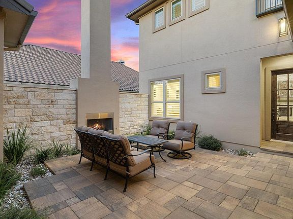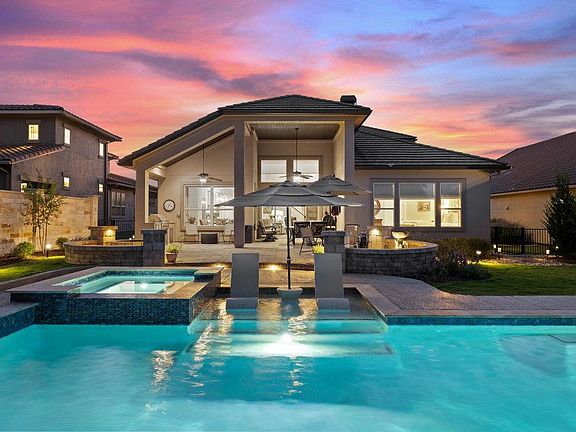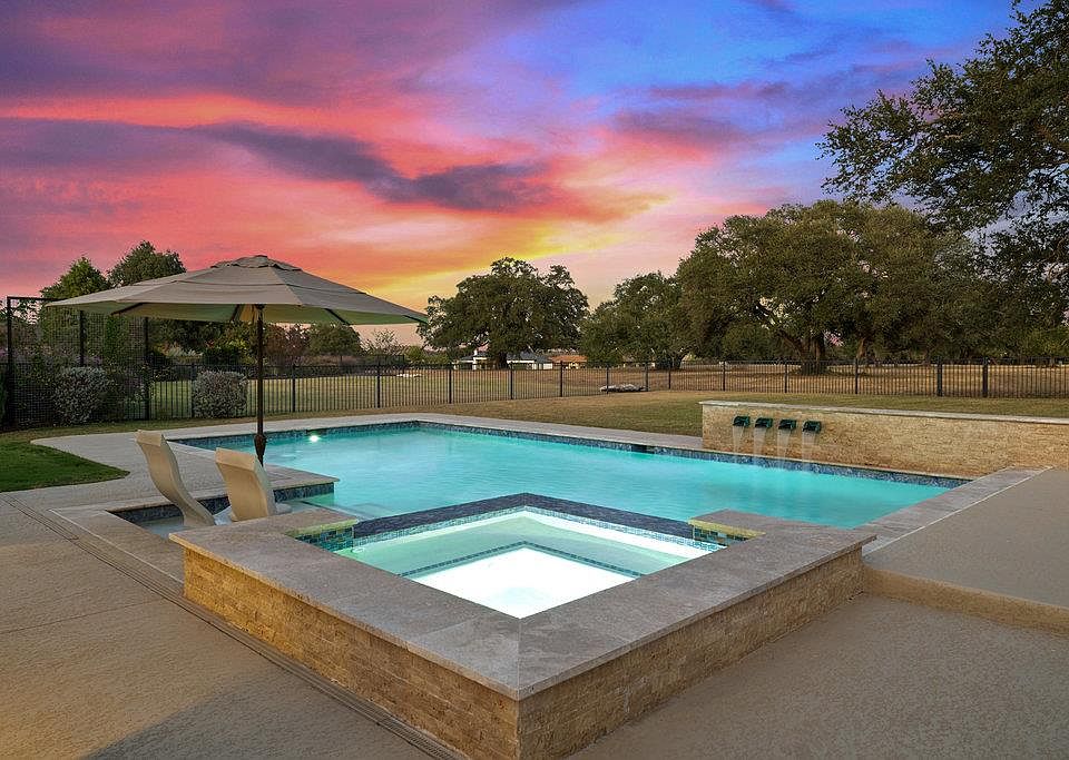 Modern waterfall effectFloor-to-ceiling stone fireplaceHigh beamed ceilingPrivate courtyard entryImpeccable homeDedicated officeHeated spa