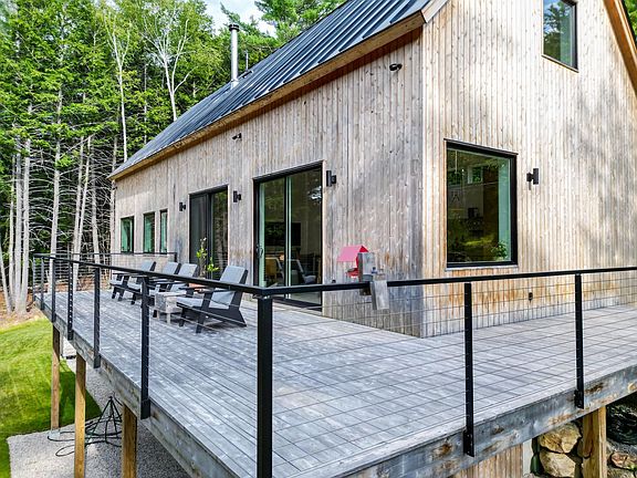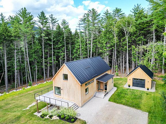Contemporary 3+ bedroom home on 1.2 acres abutting Kearsarge Brook. Located near North Conway Village, yet offering ample space and privacy on this wooded lot. Recently constructed in 2021, the home is spacious and modern, with features such as hardwood and tile floors, vaulted ceilings, a large kitchen with an island, quartz countertops, an induction cooktop, floating shelves, and a separate walk-in pantry. The dining area leads out to a large wrap-around deck overlooking the backyard, which features gardens, a shed, an outdoor shower, a grassy yard, and beautiful wildflowers that border the property. Completing the first floor is a primary suite with double sinks and a soaking tub. Upstairs is a half-story with a private guest room. The walkout lower level has an additional bedroom suite, a bonus room, and a large living room area.