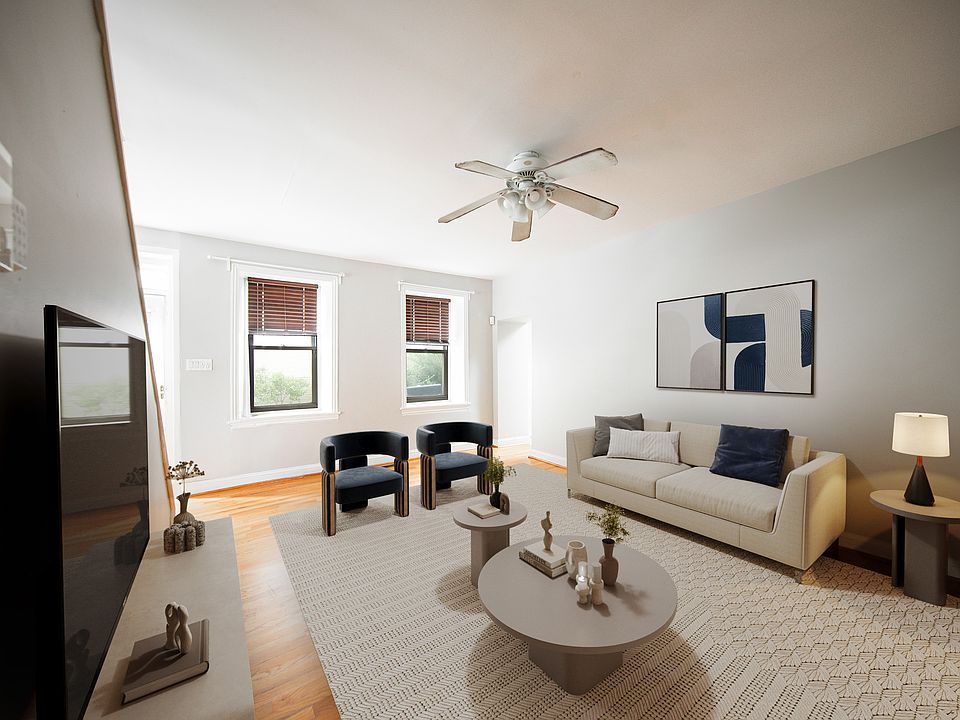 Step inside to find a bright, open layout with gleaming hardwood floors, a spacious living area, and large windows that flood the space with natural light.