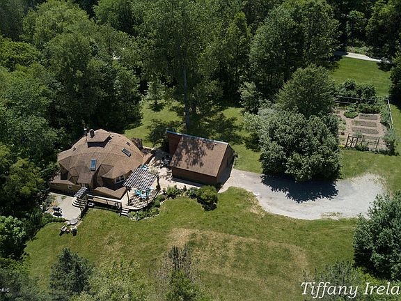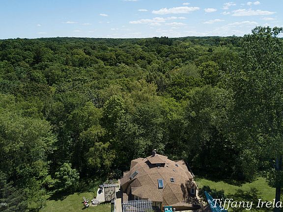 Rare opportunity to own this architectural delight - a Geodesic Home! This home was specially designed to be efficient. Air is strategically funneled up, when the windows are opened in the cupula on top - making central air rarely necessary. 2 Acres with frontage on Honey Creek! The main floor is a wonderful space for entertaining with an open kitchen, custom built by a master carpenter Cherry cabinets, granite snack bar, subzero fridge, stainless steel appliances, pantry, extra large tile entry that flows into the kitchen. A door takes you to a brick patio that ties into the large front deck w/Pergola. Great room w/cathedral ceilings & large hexagonal shaped ceiling tiles in the sunken living room & dining area, complete w/window nooks, built in seating, built in book cases, round fireplace & new lighting. Mud room, laundry & full remodeled bathroom. Main floor office/bedroom. Slider to the covered deck overlooks the woods and you can hear the peaceful babbling of Honey Creek.