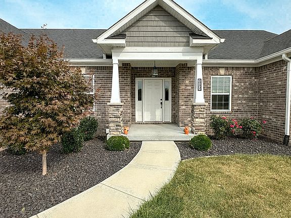 Welcome to this beautiful 4-bedroom, 2.5-bath home offering 2,160 sq. ft. of open-concept living on a .5-acre lot. Built in 2021, this property blends modern design, thoughtful upgrades, and everyday functionality. Inside, a spacious foyer opens to the vaulted great room with a stone fireplace and abundant natural light. The kitchen is designed for both style and function with granite countertops, soft-close cabinetry, a walk-in pantry, and modern light fixtures. The dining area flows seamlessly into the living space, perfect for gatherings and entertaining. Off the kitchen, you'll find a convenient half bath and laundry room leading to the attached 3-car garage. The split floor plan includes 3 guest bedrooms, each with walk-in closets, plus a full bath with shower/tub combination, and linen storage. The primary suite features dual walk-in closets, a spa-inspired bath with walk-in tile shower, granite countertops, and an additional linen closet. Bathrooms and kitchen are all finished with soft-close cabinetry for a refined touch. Additional features include vinyl plank flooring throughout, custom blinds, and neutral paint tones. The fourth bedroom is currently used as a home office, offering flexibility for work or guest space. Outdoor living is equally impressive with a covered patio, Bullfrog 8-person hot tub perfect for relaxing and entertaining. The curb appeal shines with thoughtful landscaping, upgraded stone accents, and a wide concrete driveway. A 24x40 detached brick garage with insulation and 100-amp service provides excellent storage and workspace. A water filtration system, and upgraded finishes, including tile in all baths and granite counters in both kitchen and baths add even more value. Enjoy golf course views and easy access to the cart path, clubhouse, and walking trail. The downtown square provides the perfect small-town charm with shops, dining and a welcoming local taphouse. *Select photos are virtually staged for visualization purposes only.