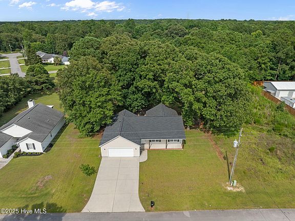 Welcome to 112 Fodder Drive - a ranch-style home located just outside city limits in Hubert with no HOA! Conveniently situated less than 20 minutes from area military bases, shopping, and entertainment, this home offers both comfort and accessibility. Step inside to a bright and open living room with front-facing windows that fill the space with natural light. The kitchen seamlessly connects to the living and dining areas, making it perfect for entertaining or keeping an eye on things while you cook. The split floor plan provides privacy, with the owner's suite tucked away on one side featuring a spacious walk-in closet and private bath. Two additional bedrooms and a full bathroom are located on the opposite side of the home. Other highlights include a covered front porch, two-car garage, and a dedicated laundry room that leads directly to the garage. Sitting on a generous .41-acre lot, the fully fenced backyard includes a patio—ideal for outdoor gatherings, pets, or play. Don't miss your chance to own this well-maintained home in a quiet setting with no city taxes or HOA restrictions!