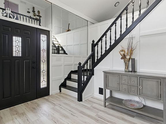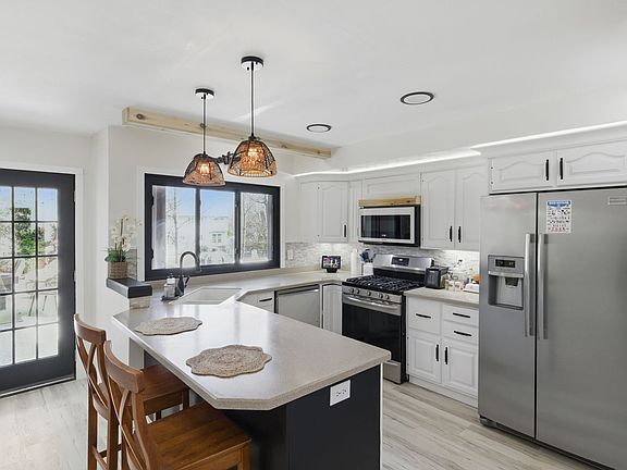 1/2 bathroom and laundry room. Large entry foyer with hanging chandelier. Large living room with floor-to-ceiling windows. Kitchen renovated with new appliances.