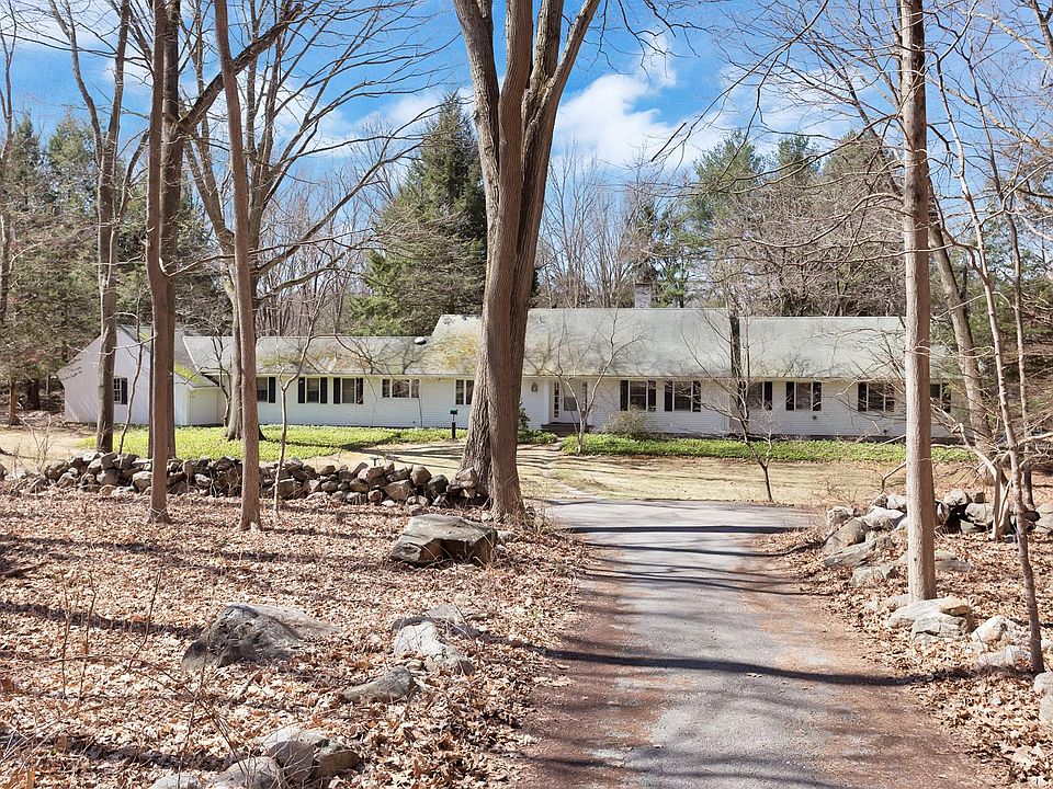 Sought after home, on level 4 plus acres, on Honey Hollow Road Bedford, directly across from Ward Pound Ridge Reservation. Enjoy the park's year round activities. Custom built, one level home, has oversized rooms, hardwood floors, floor to ceiling windows, and two wood burning fireplaces. Wonderful floorplan, room for horses and a Pool site. Waiting for a creative mind to put their stamp on this rare offering.