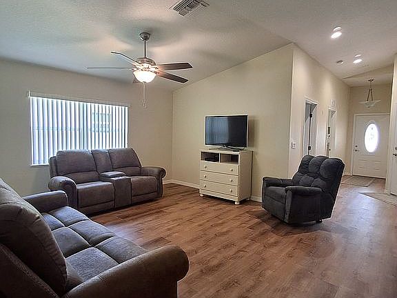 Furnished Newer home in Covered Bridge with a low HOA fee of $102 per month that includes basic cable and lawn mowing!! 2 Bedroom 2 full baths. Private home with no front or rear neighbors. 2 Car Garage with Electric full screen garage door with remotes keeps the sun and bugs out. . GENERAC system so worries about power outages. Extended enclosed 16x16 back Lani. All luxury vinyl flooring, no carpet. Tall cabinets in the kitchen with a nice walk in pantry. Spacious master bedroom with walk in closet. Custom blinds. Front Hurricane shutter. Gutters on whole house. Attic access with ladder. Separate lawn irrigation system. Furniture and appliances stay so bring your clothes move in ready. Located in Central Florida so only 2 hr. drive to either coast.