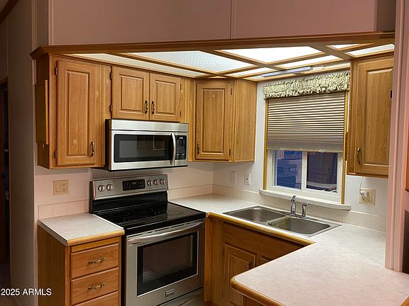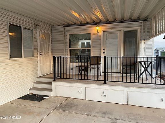 Adult community 1 bedroom 1.5 baths, with raised and vented Arizona Room. Queen Murphy Bed in Arizona Room could make for 2nd Bedroom. Carport. Tub and shower. Built in storage cabinets and closets in master bedroom, Vaulted ceilings, upgraded ceiling fans, flat top range/oven, built in Microwave, built in pantry, space for full size refrigerator, window treatments, wood laminate floors, carpeting, raised covered porch with storage below. Security doors and sunscreens. Move in ready.