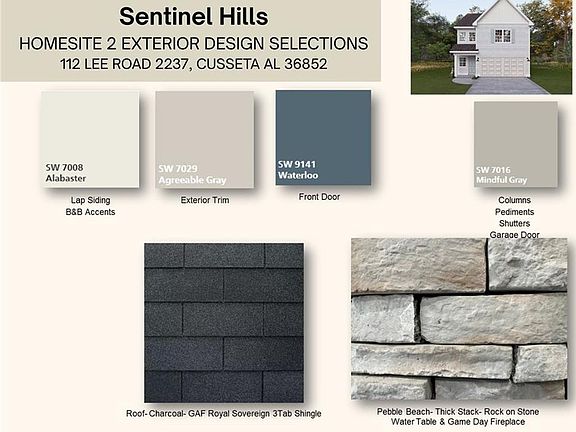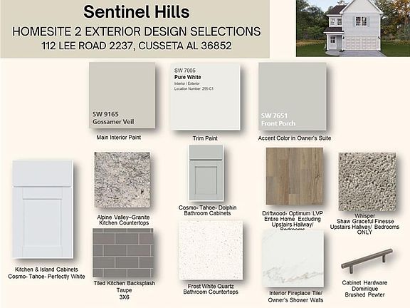 Welcome to Sentinel Hills, a Hughston Homes Community, where comfort meets style in the heart of Cusseta, Alabama—just minutes from Opelika. Step inside The Hunter Floorplan, a beautifully designed two-story home offering 1,729 sq. ft. of bright, open living space with 3 bedrooms and 2.5 baths. From the moment you enter the stunning foyer, you’re greeted by an inviting great room with a cozy wood-burning fireplace, setting the tone for relaxed, modern living. The gourmet-inspired kitchen impresses with its sleek cabinetry, granite countertops, tiled backsplash, stainless steel appliances, and a large island complete with sink and dishwasher, perfect for cooking, gathering, and entertaining. The kitchen flows effortlessly into the dining area and great room, with a spacious pantry keeping everything organized. The half bath on the main level is convenient for guests. Upstairs, the owner’s suite is a true retreat with tray ceilings, abundant natural light, and a massive walk-in closet. The spa-style bath offers a garden tub, separate shower, and double sinks for added luxury. Two additional bedrooms feature generous closet space and share a stylish full bath, while the upstairs laundry adds everyday convenience. Enjoy luxury vinyl plank flooring throughout the main living areas, a two-car garage, and our signature gameday patio with a wood-burning fireplace, an ideal spot for relaxing evenings or weekend gatherings. Thoughtfully crafted and full of upgrades, The Hunter blends comfort, craftsmanship, and modern design in one stunning package.