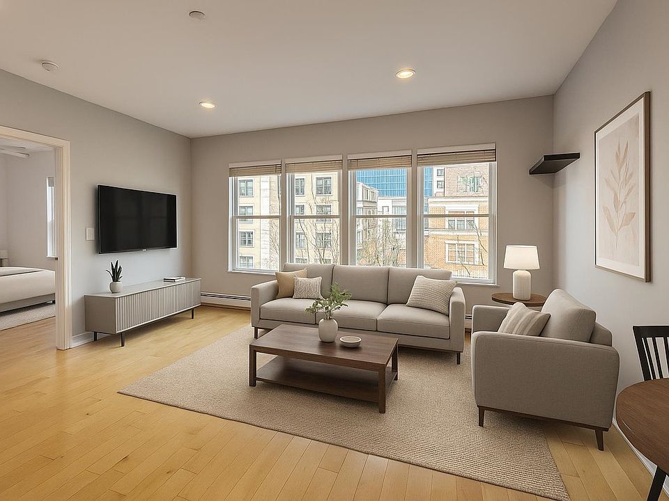 Modern kitchenGleaming hardwood floorsSleek modern bathroomModern light-filled homeOversized windowsRooftop poolWalk-in closet