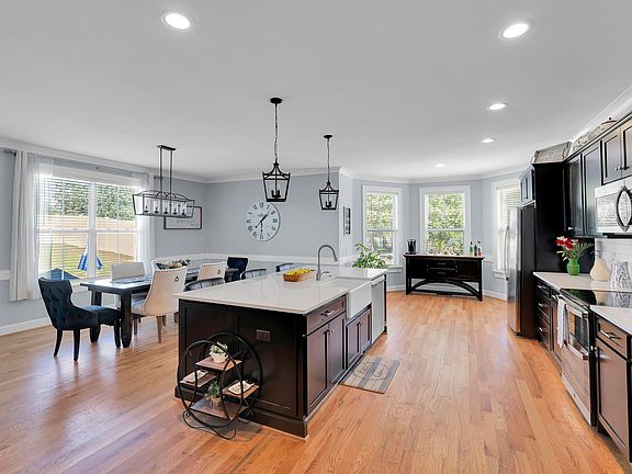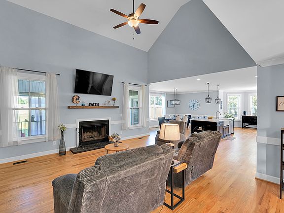 Welcome to Saddlehorn, a community where equestrian charm and peaceful rural living blend seamlessly with modern luxury. This custom-built home rests on a generous 0.73-acre lot and offers over 2,800 square feet of beautifully designed living space including a newly finished upstairs offering a potential second primary bedroom with private bath. From the moment you arrive, the curb appeal is undeniable—Masonite siding, timeless farmhouse details, and a sweeping 40-foot rocking chair porch overlooking the wooded landscape set a warm and welcoming tone. Step through the foyer and into an open-concept living area that feels both grand and welcoming. Cathedral ceilings, rich hardwood floors, and a striking black fireplace with a handcrafted wood mantle anchor the room, while oversized windows flood the space with natural light. Sliding barn doors add a touch of rustic sophistication, tying the home’s modern farmhouse aesthetic together. The kitchen is designed for both function and beauty, featuring bold black shaker-style cabinetry, gleaming white quartz counters, and a spacious island with bar seating, farmhouse sink, and brushed nickel finishes. A charming bay-windowed nook nearby serves perfectly as a breakfast space to start your mornings. The dining area opens to a screened-in porch with vaulted ceilings, the ideal spot to relax and unwind, or entertain your family and friends! The main level primary suite is a true retreat with vaulted ceilings, a spa-like bath complete with dual vanities, an oversized tiled shower with rainfall and wall heads, and an expansive walk-in closet. Two additional guest bedrooms share a stylish full bath, while the newly finished second floor presents endless possibilities—as a second owner suite, guest bedroom, a media room or an office space. Outdoors, the backyard balances privacy and views. White iron fencing frames the property, offering an open vantage point of the neighboring horse pastures. With room for a pool—and preliminary plans already in place—you have the opportunity to create your own private oasis. Life in Saddlehorn extends beyond the property, with 75+ acres of community pastures, a fully stocked fishing pond, and miles of walking trails to enjoy. A two-car garage, storage shed with riding mower, and low HOA fees complete the package. This home offers not just a place to live, but a lifestyle that blends tranquility, recreation, and timeless elegance. Call and schedule your private tour today!