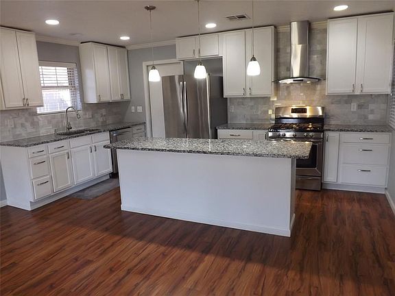 Very nice updated home. Three bedrooms with two full bathrooms. Home has all tiled or plank wood floors. NO CARPETS. Open floor plan with a nice kitchen. STAINLESS APPLIANCES gas cookstove, dishwasher & side by side refrigerator, GRANITE COUNTERTOPS, Island, White cabinets, newer updated light fixtures & ceiling fans. New interior doors, new tiled bathrooms. Both bathrooms have tub/shower with updated vanities & toilets. Can lighting. Home has a security system which stays. Backyard is very large with mature trees for great shade. Large covered patio. Privacy fenced backyard. Home has been well maintained & move in ready.