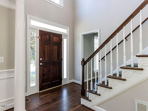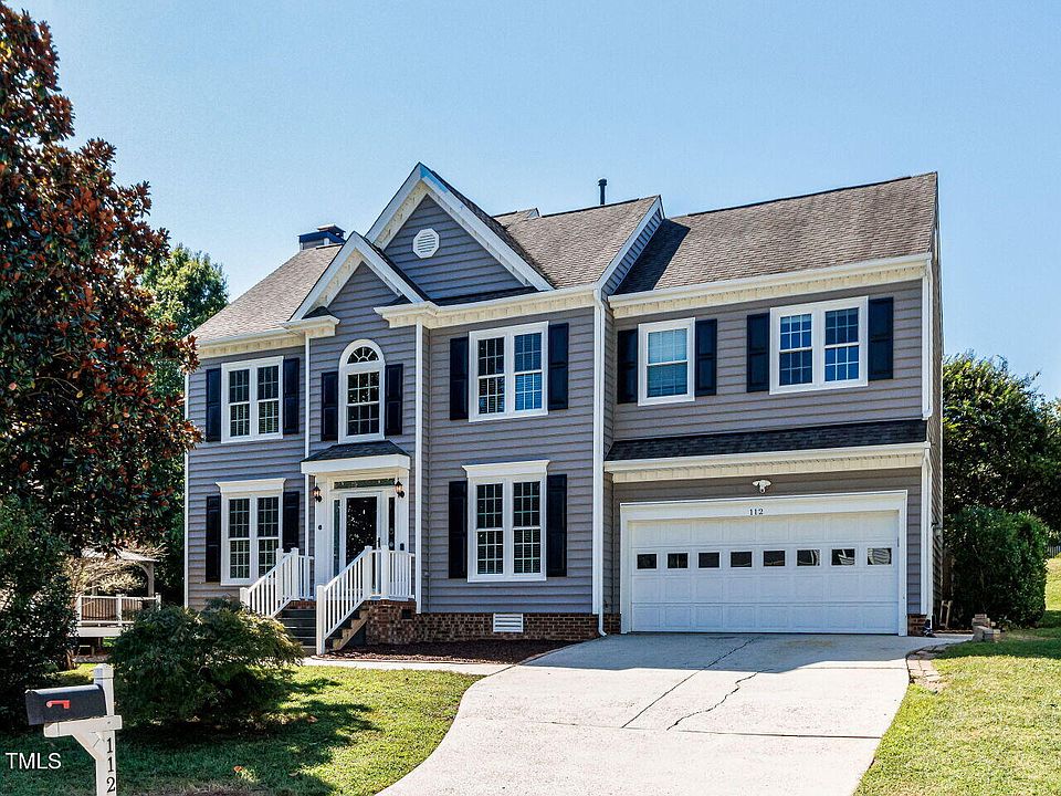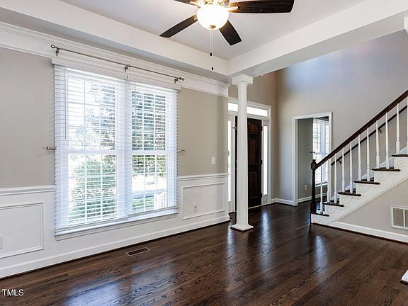 Fresh neutral interior paint! Convenient 2-story Cary home w/ fenced rear yard, screened porch w/ cathedral ceiling, ceiling fans & 2 mounted fans for staying cool in NC summers. Hardwoods in most of the common areas. Built-in bookcases & shelves in office/living room area. Dining room features decorative pillars, trey ceiling, wainscotting & soft accents. You'll enjoy granite counters, SS appliances, smooth-top range, built-in desk space, a pantry, disposal & view to backyard, adjacent to the breakfast nook w/ a wall of windows. Nearby family room has ample natural light as well, filling the open main level. Upstairs there are gleaming, durable laminate floors in all three bedrooms w/ walk-in closets & ceiling fans. Versatile 4th bedroom can double as a bonus room w/ a flex space attached. Roof 2015, new windows 2021. The crepe myrtle in the back yard has recently showed a fungus and is being treated by a tree specialist.