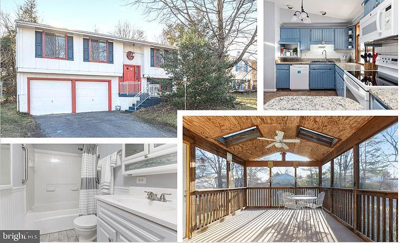 Welcome home! This sweet and well kept three bed, two bath Sterling Park charmer is ready for its new owners. This home is located on a great quiet street and boasts so many great features, including a huge driveway with parking for four cars, a deep two car garage, and a private and tranquil fenced backyard with mature trees and a prepared gardening area. Freshly painted throughout. The generous entryway features marble flooring, solid oak staircases and woodwork (which you will find throughout the home), and open railed staircases to allow for great sightlines. The main level is drenched in natural light with vaulted ceilings, plenty of windows, and a beautiful skylight in the kitchen. The open floor plan with continuous flooring throughout is perfect for modern living. The custom kitchen is just adorable with charming solid wood blue beadboard cabinetry, granite countertops, and upgraded appliances. The spacious and beautiful screened porch provides the perfect place to enjoy the outdoors in comfort, with two skylights to bring in the natural light, additional outside deck space, and stairs down to your fabulous fully-fenced yard. Down the hall you'll find three lovely bedrooms and a custom remodeled bathroom, which has a deep soaking tub and en suite access from the primary bedroom. The large lower level features beautiful custom trim work, a generous family room, a second custom full bath, loads of storage, and a large laundry/utility room. This home really has it all. Hurry! This one won't last...
