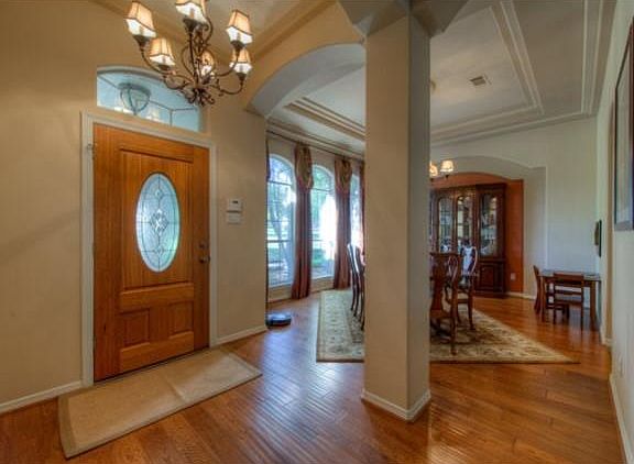 Elegant Jimmy Jacobs custom home setting on approx. 1.5 acres!Spacious 4/2.5 MIL plan,Many upgrades,Tray ceilings,gorgeous fixtures & hardware throughout home. Fall in love with the kitchen 42" cabinets,granite kitchen counters,walk in pantry,cntr island.Tranquil private backyard with iron fence & large trees. Backs to greenbelt.Oversized 3 car garage.Lge covrd back porch.Wired for surround sound.Corner FP and Arched doorways. A must see! Pride of ownership.