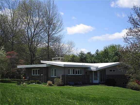 This 3 bedroom ranch style home is a unique property custom built & designed by the original owner, an Architect. Open living room/dining room with hardwood floors, fireplace, accent walls of brick and wood and a wall of windows with a gorgeous view and access to the backyard. The large kitchen is ready for you to update to fit your needs. Convenient first floor laundry room is separated from kitchen by a pocket door and has access to the backyard. A full bath & powder room are both located on the main level. The master bedroom has a ceiling fan, 2 closets and a brick accent wall. This homes entry closet, pantry next to the kitchen and hallway closets all have unique doors. The lower level is not finished and offers a fireplace & two car garage. Lot is almost an acre (.88) - Must see to appreciate this homes charm.