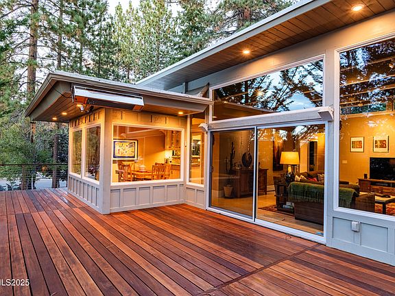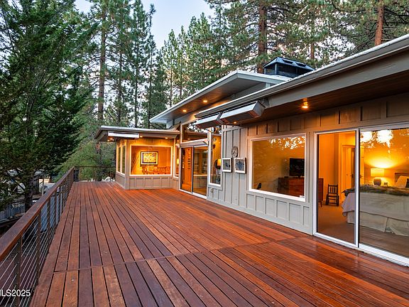 An iconic mid-century modern retreat in the lakefront community of Skyland, where clean architectural lines meet Lake Tahoe's natural beauty. This 5-bedroom, 3.5-bath residence is defined by dramatic floor-to-ceiling glass that frames filtered lake views and floods the interiors with natural light. Cork, slate, and marble floors pair with solid wood interior doors, custom built-ins, two fireplaces, and refined design details that embody timeless elegance. The primary suite opens to a lake-view Camaru wood balcony and features heated marble floors, dual sinks, a walk-in shower, and bespoke cabinetry. Upstairs, two bedrooms share a secondary bath with a jetted soaking tub, adding to the home's spa-like amenities. At the heart of the home, a chef's kitchen boasts slab granite counters, bespoke cabinetry, a commercial-grade gas range with dual ovens and oversized hood, and Ashley Norton architectural hardware. Comfort and efficiency are elevated by a Lochinvar modulating boiler, Italian cast iron baseboard heating in the dining and living rooms, and a three-zone hydronic system with future expansion capacity. The property also includes a 220V EV outlet and is stubbed for a gas grill, additional hydronic heat, electricity, and IT all carefully thought out for future expansion over the existing driveway, where coverage already exists. Set on a landscaped corner lot refreshed by Sunbasin Landscape and Nursery, the home highlights a generous Camaru wood deck with stainless steel and Camaru railing, harder and more durable than IPE. A saltwater oversized hot tub and private sauna with direct bath access provide the ultimate retreat. A porte cochère creates a striking entry, while an oversized two-car garage offers ample storage and utility. Just a short stroll away, Skyland residents enjoy access to a private community beach, underscoring the exclusivity of this Nevada-side location. Recent upgrades including a new roof (2024), skylight (2025), Generac backup generator, radon mitigation system, and BMPs, ensure peace of mind in a residence that is as healthy and practical as it is inspiring.