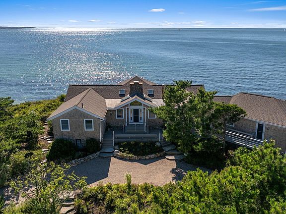 Set in the coveted Racing Beach community, this exceptional waterfront home offers panoramic views of Buzzards Bay with the comfort and convenience of single-level living. Located just a stone's throw from the association beach, classic Cape Cod charm is on full display throughout. A spacious living room with a grand stone fireplace is flooded with natural light through walls of glass overlooking the water, and seamlessly connects to the adjacent eat-in kitchen. The primary suite enjoys its own private wing with direct access to a wooden deck that spans the entire waterside of the home. Thoughtfully designed to embrace outdoor living and dramatic sunset views, a covered portion of the deck is perfect for al fresco dining over Buzzards Bay. Three additional bedrooms, all with water views, provide ample accommodations for family and guests, while a bonus room offers flexibility for any occasion. An attached two-car garage completes this spectacular home, located minutes from Woods Hole, downtown Falmouth, and everything the area has to offer. With sweeping views and a picturesque beach just steps away, this extraordinary coastal retreat embodies Cape Cod living at its finest.