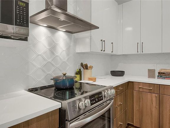 Sleek contemporary kitchenOpen-concept layoutNatural lightStainless steel appliancesExpansive rooftop decksWhite cabinetsWhite quartz countertops