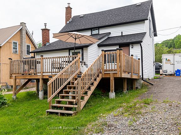 Welcome to this charming riverfront home or cottage in the heart of the Village of Burks Falls, offering a peaceful lifestyle with in-town conveniences. This 1.5-storey residence is perfectly positioned on a level lot with nearly 50 feet of east-facing frontage along the Magnetawan River, where you can relax and watch the sunrise or hop in a boat and explore the scenic route all the way to Lake Cecebe. With two bedrooms plus a den and one full bathroom, this home offers a flexible layout ideal for year-round living or weekend escapes. Step inside through the mudroom foyer and into the inviting living room, a comfortable space that leads to the updated kitchen, complete with newer appliances. Just beyond is the laundry room with access to the back deck, perfect for grilling or enjoying the river view. At the front of the home is a useful main floor bedroom which could also make a great office space for working from home. A 3-piece bathroom is conveniently located near the stairs, and upstairs you'll find two generously sized bedrooms filled with natural light. Access to the basement is through the main floor bedroom; this lower level has been fully spray-foamed and features a natural gas forced-air furnace, central air conditioning, hot water on demand, and excellent storage. The property is connected to municipal water and sewer, and offers fibre optic internet, natural gas service, and curbside garbage and recycling pickup. Recent updates include newer shingles, newer vinyl siding, an updated bathroom, laundry appliances, and a freshly completed kitchen featuring all newer appliances. Enjoy the walkable lifestyle of Burks Falls, just a few doors down from the picturesque Heritage River Walk and the iconic covered footbridge. This is a place where peaceful riverfront living meets small-town charm, your next chapter begins here.