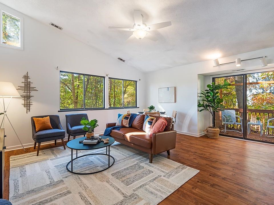 Tucked away on a cul-de-sac in the picturesque hamlet of Whispering Hills, this low-maintenance townhome near downtown Carrboro has three bedrooms and a full bath for each – one pair of which is on the main level. Also on the main level is a huge, vaulted living room, a deck and an open kitchen with the functionality of a much larger space. The updated interior includes immaculate flooring,  generous natural light, and plenty of room to entertain the crew. Whispering Hills is a cohesive, woodsy community just minutes to bustling Carrboro. Grab a beer at Craftboro Brewing Depot or Steel String, coffee at Open Eye, or hit the hot bar at Weaver Street. Save your passion for the battle of the blues rather than the biscuit v donut debate with a trip to Rise. Hit Morgan Creek Trail and watch the sun set at Merritt’s Pasture or listen to your favorite band at the iconic Cat’s Cradle. Meow!