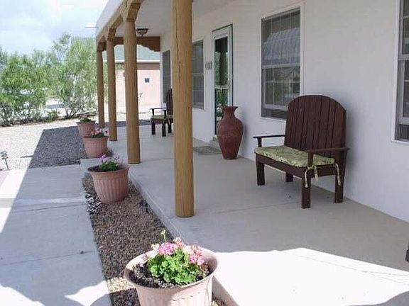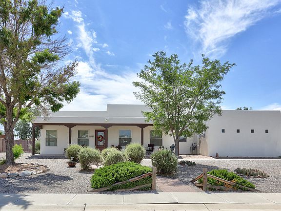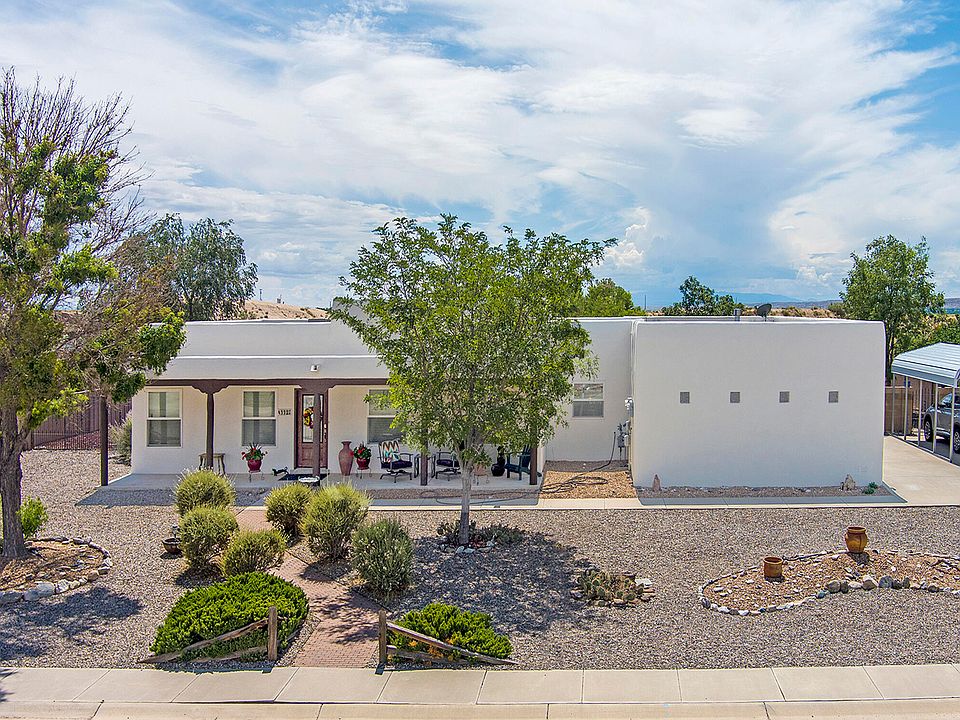 Say YES to the Address! 112 San Lucas Ave, in Rio Communities! Rare opportunity to own this FANTASTIC split bedroom floorplan featuring a private master suite w huge/walk-in closet & bath, large eat-in kitchen plus formal dining area. Keep allergies at bay with all tile flooring and radiant heat! OWNED Solar (More Features in MLS Docs)! Spacious utility room adjacent to kitchen, living room with Kiva fireplace and vigas, 2 other bedrooms with walk-in closets and Jack/Jill bath w/2 sinks separated by large walk-in shower. A delightful backyard w/covered patio and carefree metal pergola to enjoy mountain vistas. 2 Tuff Sheds (10 x 12) for your storage needs. SW Rock landscaping with mature trees and shrubs, carport too! Act FAST!