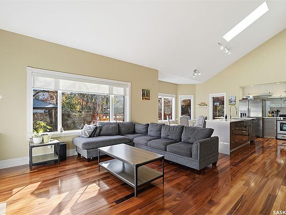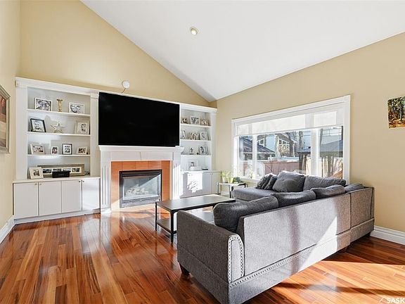 Quiet elegance is what you will feel in this stunning 2 storey located on a historic street close to the river with loads of curb appeal. The entrance leads you into a grand open concept living space with loads of natural light and vaulted ceilings that seem to go on forever. A bright skylight, stainless steel appliances, adjoining living room with fireplace and engineered hardwood flooring make this living space a place to gather with family and friends. What would make this gathering place even better? Main floor wet bar of course. This home has everything! There is main floor laundry, direct entry to garage as well as direct access to the backyard and 2 tiered deck with hot tub right off the dining room and kitchen. The primary suite boasts a stunning 5 piece ensuite with his and hers sinks, soaker tub and separate shower. There are 2 other good sized bedrooms and 4 pc bathroom. The finished basement is perfect for a family – loads of space for teens to occupy or for a young family to have a play area for small children. The backyard is an oasis with a hot tub, 2 tiered deck leading to lush grass and assorted foliage. The home is located steps away from the South Saskatchewan River and all the wonderful walking paths. Enjoy sunrises and sunsets on the front porch or back deck, either way, it is luxury at its finest! Call now to book your private showing.