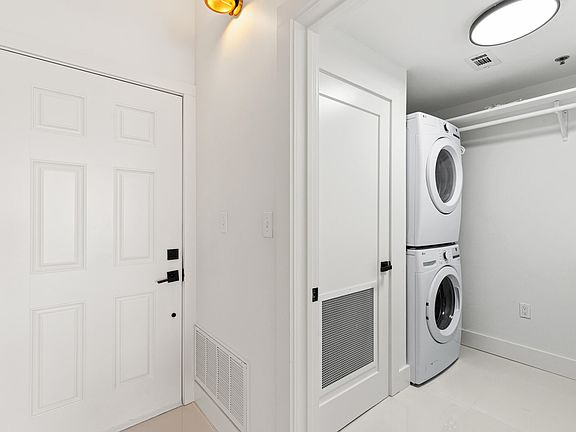Both bathrooms are beautifully updated with quartz countertops, porcelain sinks, custom mirrors, LED lighting, and designer finishes. The primary bathroom features wall-to-wall tile, a walk-in shower, and a separate soaking tub for ultimate relaxation.