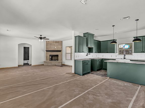 The kitchen features leathered granite countertops, providing a durable and stylish work surface, while the open living area centers around a hand-laid, floor-to-ceiling stone fireplace with a stone hearth a cozy focal point for gatherings.