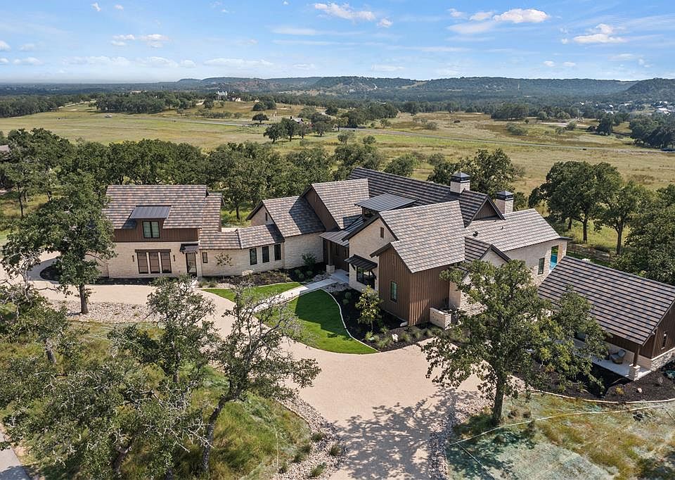 Welcome to 112 Spicewood Trail, a stunning modern farmhouse retreat located just moments from the main entrance of the prestigious Boot Ranch community. Situated on 4.01 acres, this elegant estate blends sophisticated design with serene Hill Country living — and offers breathtaking views of the longhorn pasture that add to its unique charm. Boasting 5 bedrooms, 5.5 bathrooms, and 5,645 square feet of expertly designed living space, this home was crafted for comfort, luxury, and effortless entertaining. The gourmet kitchen features sleek custom cabinetry, a spacious island with seating, premium appliances, and designer lighting — all flowing seamlessly into the open-concept living areas with vaulted ceilings and warm natural tones. Step outside to the ultimate Hill Country outdoor living experience: a spacious covered patio with a fully equipped outdoor kitchen, wood-plank ceiling, and cozy seating areas overlooking a resort-style pool and spa — all framed by mature oaks and open ranch views.