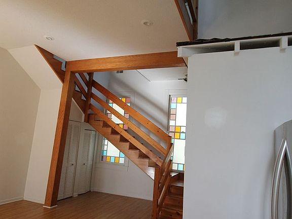 Pergola patio areaBeautiful wooden staircaseRenovated old churchStain glass windows