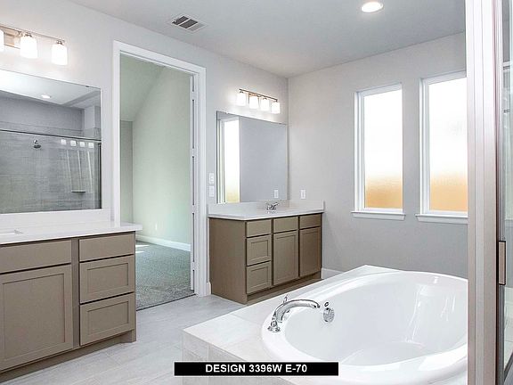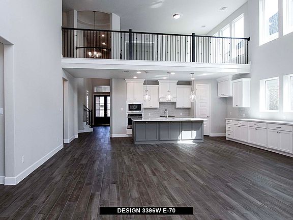 This spacious design features a two-story rotunda entry. Home office with French doors across from curved staircase. Open kitchen offers corner walk-in pantry, generous counter space and inviting island with built-in seating space. Two-story dining area opens to two-story family room with a wood mantel fireplace and wall of windows. First-floor primary suite includes bedroom with 13-foot ceiling and wall of windows. Primary bath includes dual vanities, garden tub, separate glass-enclosed shower and two large walk-in closets, one with access to utility room. First-floor guest suite. A game room, media room with French doors and two secondary bedrooms are upstairs. Covered backyard patio. Three-car garage.