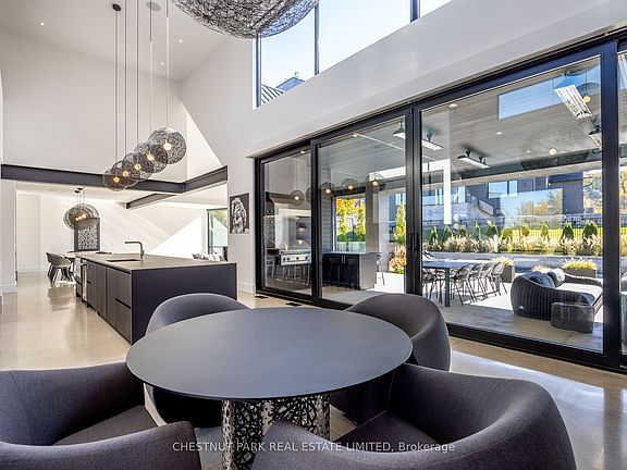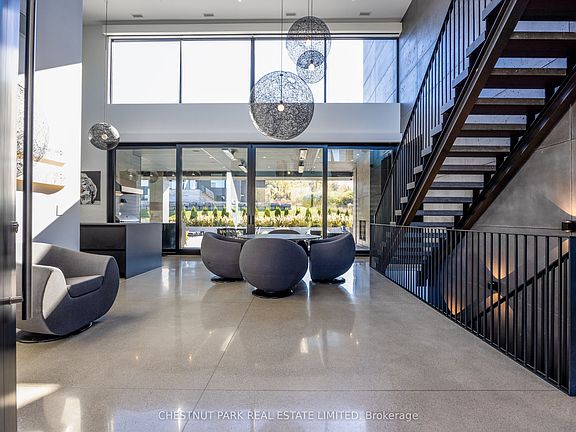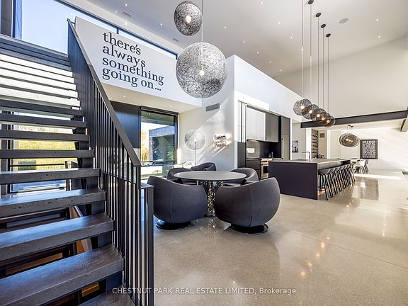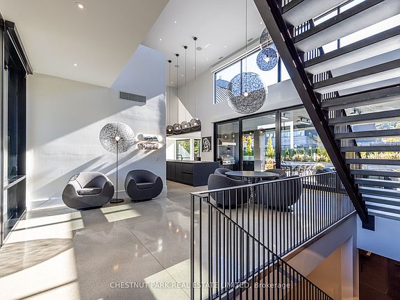 Architecturally stunning custom home in the exclusive Camperdown community, a coveted year-round golf, ski, and outdoor playground that epitomizes four-season living in Southern Georgian Bay. Over 9,000 sq.ft. of refined living space with soaring 20-ft ceilings, exposed beams, heated polished concrete floors and dramatic floor-to-ceiling windows that flood the interior with natural light. The sunken great room with a 24-foot stone fireplace exudes warmth and comfort - a space equally suited for quiet evenings or entertaining a hundred guests with ease. A striking matte-black kitchen anchors the main level with an 18-ft island, Wolf & JennAir appliances, and a fully equipped butler's kitchen for seamless hosting. The private primary wing is a true retreat featuring a fireplace, dual walk-in closets, and a spa-level ensuite with mountain views and a walkout to the hot tub. Upstairs, a junior primary suite impresses with vaulted ceilings, a 6-piece ensuite, and a private terrace, while two additional bedrooms open to a covered patio with escarpment views. The lower level is an entertainer's dream with a games lounge, wet bar, golf simulator, gym, music studio, and two more bedrooms. Outdoors, enjoy resort-inspired living with a waterfall pool, hot tub, and a covered lounge with wood-burning fireplace and built-in BBQ. Legal golf cart access to the Georgian Bay Club, and just minutes to Peaks, Blue Mountain, Thornbury, and Collingwood. A rare offering that captures the very best of four-season living in Southern Georgian Bay.