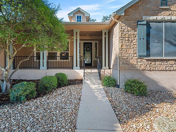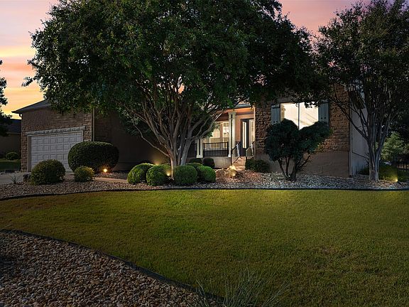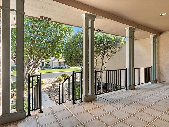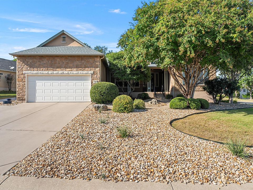 This stunning Del Webb Bowie floor plan is perfectly situated on a spacious .34-acre corner lot, offering beautiful curb appeal, mature trees and a sense of privacy. Whether you're sipping coffee on the welcoming front porch or inviting guests in through the impressive 8-foot front door, this home sets the stage for comfort and connection. Inside, rich hardwood floors run throughout the living area and all three bedrooms—no carpet in sight—offering both timeless charm and low-maintenance living. The heart of the home features gorgeous hickory cabinets, granite countertops, tall ceilings and windows galore. Enjoy year-round relaxation in the four-seasons sunroom, a perfect spot to start your day or unwind with an evening book. The oversized garage includes a separate golf cart entrance, ideal for cruising the neighborhood in true Sun City style. And don't forget the amazing lifestyle in Georgetown’s premier 55+ active adult community, where resort-style living includes 3 golf courses, pickleball, tennis, fitness centers, resort-style pools, and countless social clubs and activities.