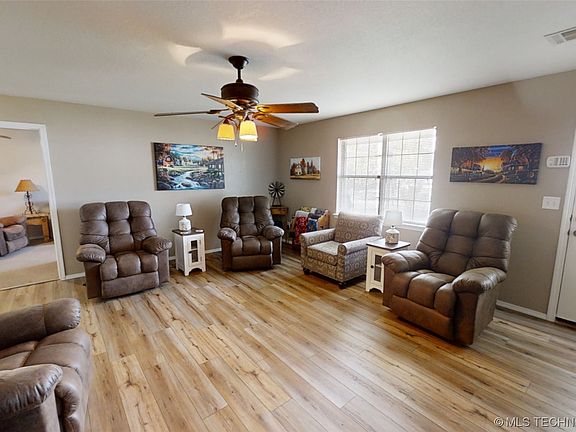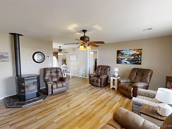 This freshly updated property features fresh paint, new floors, an expanded back patio, and a pellet stove for added warmth. It includes a detached 2-car garage, a shop, and storage buildings. Don't miss this cozy retreat with modern upgrades and great outdoor access! Less than a 5-minute drive away, you'll find yourself at the breathtaking Eufaula Lake Dam, where you can enjoy the tranquility of the water, fishing, or embark on a leisurely hike. Brooken Cove and Lady Bird Campgrounds are also within easy reach