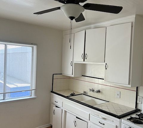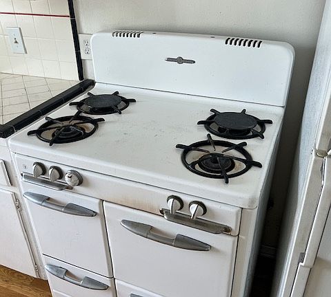 Vintage style ceiling fanVintage gas stoveRoom for dining tableHardwood floor upper aptMini blindsAmple closet spacePedestal sink in bathroom