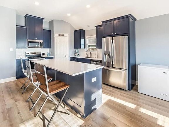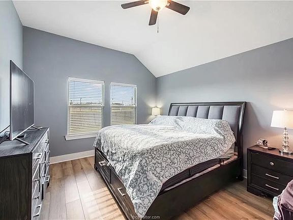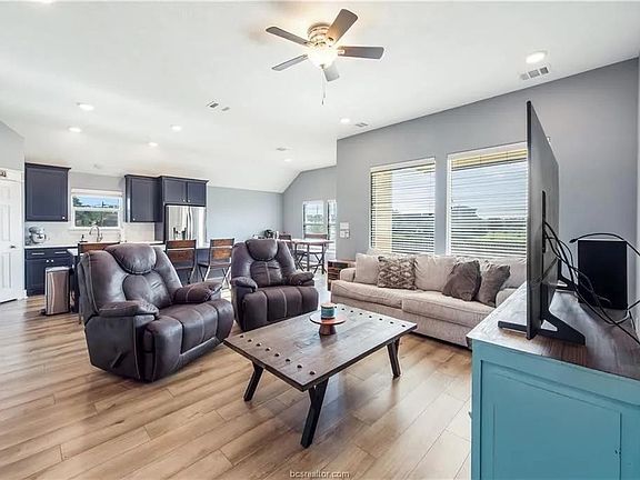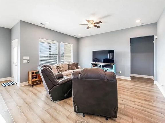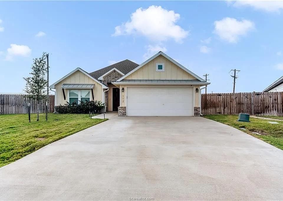 Welcome to this charming, farmhouse-style home located on a spacious cul-de-sac lot in the peaceful Grand Lake Snook community, just 20 minutes from College Station! This beautifully designed four-bedroom, two-bath home is a little over two years old and features modern designer touches throughout. Enjoy one of the largest lots in the subdivision, with plenty of space in the backyard! Step inside through the stunning 8-foot solid wood front door and be greeted by an open-concept layout perfect for both daily living and entertaining. The kitchen, featuring sleek white granite countertops, seamlessly flows into the living room and offers a separate dining area for family meals or gatherings. The split floor plan ensures privacy, with a suite that has a luxurious en-suite bath complete with a walk-in shower, a separate soaking tub, and a convenient laundry room attached to the closet. This home is designed for modern living with high-speed internet included in the HOA, wiring for a security system, and a mudroom off the garage for easy storage of backpacks and bags. Other standout features include luxury vinyl plank flooring throughout (no carpet!), 2-inch custom wood blinds, and a built-in sunscreen for enjoying the back patio year-round. With the best price per square foot in the neighborhood, this home combines style, function, and value in one of the areas most desirable locations.