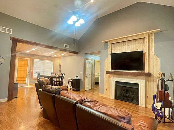 Gas fireplaceCovered patioSpacious primary suiteTall cathedral ceilingsBright kitchenCustom detailsLinen storage