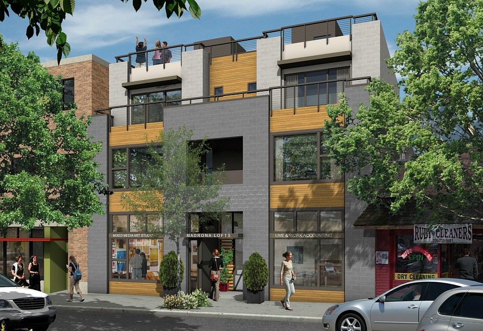 Luxury homes now available, 3 homes sold in presale, 2 townhomes remaining. Located in Madrona w/variety of chic shops and exceptional dining. Complete in Spring 2015, 3 townhomes w/garages, 2 live-work lofts with street facing commercial space. Design features modern & industrial elements, bright spaces and luxurious finishes: HW flooring, slab quartz countertops & state of the art appliances. Private rooftop deck w/360 degree views, Lake Washington, and glimpses of Downtown Seattle. No dues!
