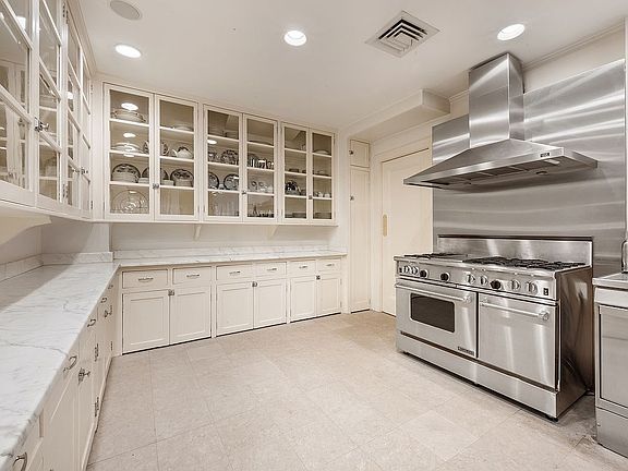 A spacious, windowed eat-in kitchen, complete with glass-front cabinetry, professional grade stainless steel appliances, and marble countertops, leads off from a well-equipped butler’s pantry. The media room offers a flexible space that can be used as a cozy den or library. Two maid’s rooms with an additional full bath have been repurposed as an office space and a laundry/utility room with full-size vented washer and dryer machines.