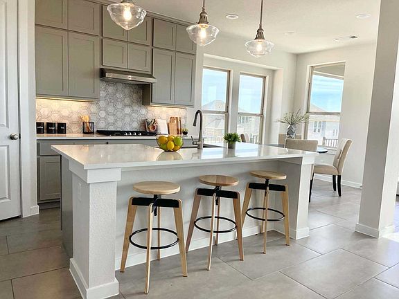 MLS# 6113825 - Built by Highland Homes - Ready Now! ~ This four sides white painted brick home has 19' ceiling at entry and dining room , 18x36" offset soft gray tiles all living areas downstairs, a fireplace and a stunning view from the top of the hill to the backyard and homes below. Chef's kitchen features gray cabinets, built in SS oven and microwave, built in 5 burner gas cooktop, Silestone quartz countertops, SS apron front single bowl sink and hexagon shaped tile backsplash. Horizontal metal balusters in lieu of half walls give an unobstructed view of dining room from the upstairs game room. Primary bedroom has a freestanding tub and separate shower. Tankless water heaters, Smart Home technology and full sod and sprinkler system are standard features of all Highland Homes.