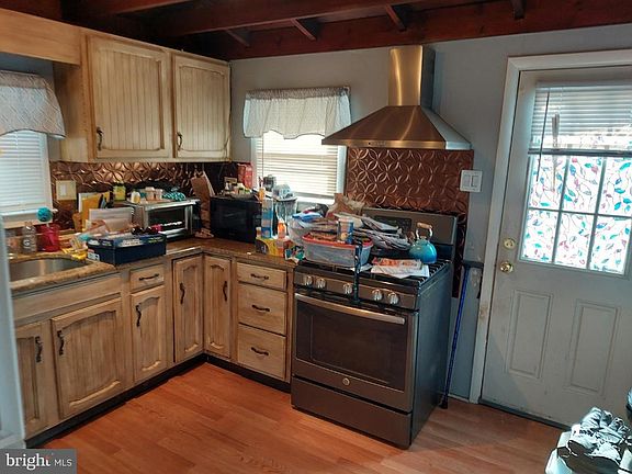 Welcome to this charming bungalow on a double lot which is fully fenced in with a 1 car detached garage. Upon entering you will experience an open concept floor plan, as the sitting room flows into the living room, dining area combo. The living room and dining areas feature oak hardwood flooring. Adjoining this area is the eat in kitchen which boosts a raised exposed beam ceiling, granite counter tops and a modern style stainless steel exhaust hood. The main bedroom which is of amble size, features a pocket door. Bedroom #2 boosts a walk in closet. The spacious bathroom has been updated. The partial basement has bilco doors to the rear yard where you will find a nice storage shed. The home also features a water treatment system. The house also features solar panels costing $79/month for a term of approximately 15 more years. The home is contingent upon the seller finding suitable housing and is being sold strictly AS IS, with the buyer responsible for any and all repairs and certifications, including the C.O.