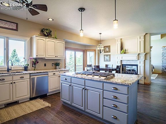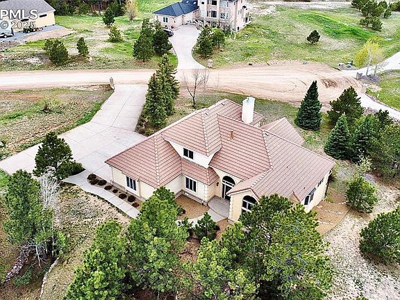 UPDATES! Welcome to your 2.5 acre oasis, with new stucco and soon new composite shingle roof, nestled on a private, treed lot with magnificent views of the mountains! This 2 story home offers a main level primary bedroom (access to the rear deck) with an attached 5-piece bath (heated floors) and walk-in closet. Head upstairs to the 2 bedrooms w/a jack-and-jill bath AND a super cute loft between the bedrooms that could be used as a toy/play/lounging area. The main level also boasts a very spacious carpeted office near the front door and a lovely formal dining room w/access to the dry bar and kitchen. In the eat-in kitchen you'll find a 2-sided fireplace, room for a kitchen table, island with stovetop, and the flexibility to walk out to the elongated deck to enjoy the majestic views of Pikes Peak. Head downstairs to the unfinished, 2000 s.f. walk-out basement to see the endless possibilities. You won’t want to miss this gem of a home located in D-38!