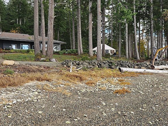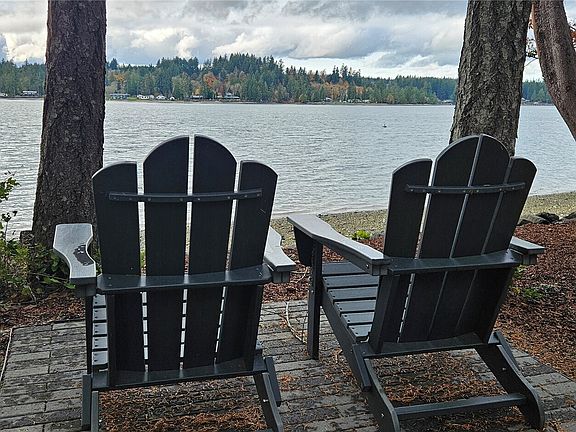 Waterfront views from this custom built one-level wheel chair friendly home completed in 2023 on this 4+ acres homesite. From the living room with gas fireplace you can gaze out across the large aggregate patio with gas fireplace to the no bank waterfront. In wet/cold weather you can retreat to the covered front porch and feel the heat from radiant gas heaters. Kitchen area features seating for 6 at the custom granite island complete with top of the line Kitchen Aid appliances including a wine cooler and beautiful Dewile cabinetry. Level and covered walk to the 3+ car finished garage with 1/2 bath, storage room, and gas heat, Power backup by a Generac generator and 1k gallon propane tank. Sec. gate & Ring cameras. Wired for solar panels.